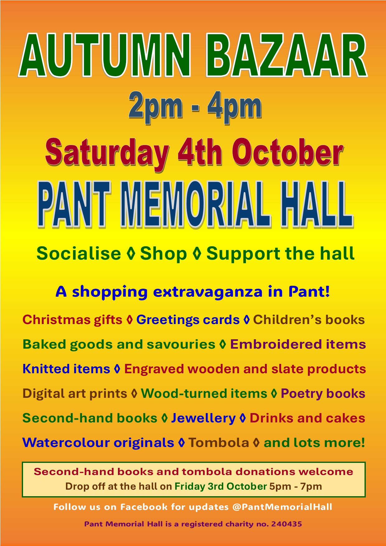 Autumn Bazaar 2025: the famous Pant pop-up shopping mall returns on Saturday 4th October, 2pm-ish to 4pm ish. Featuring lots of local traders, plus our legendary bookstall, tombola, refreshments and chatting space! Free entry and all proceeds from the bookstall, tombola and refreshments (plus stall fees) go to the maintenance and improvement of the hall.